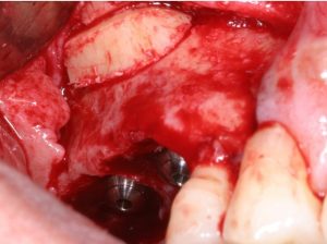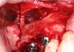 FIGURE 2. After elevation  of the  schneiderian membrane and placement  of implants, an absorbable gelatin sponge (Cutanplast; Mascia  Brunelli Spa,  Viale Monza, Italy) 70  ! 50  ! 1 mm was divided  into 3 pieces  and  inserted  into spaces anterior  and  poste- rior to the implants and below the elevated  schneiderian membrane (patient 6).