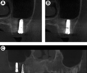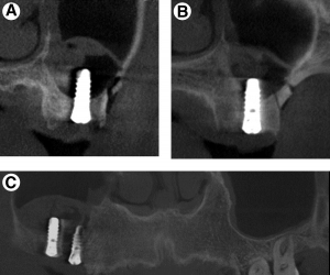 FIGURE 4. Postoperative cone-beam computed  tomographic scans revealed the sinus was filled with blood clots and voids under the elevated schneiderian membrane. A, Implant corresponding to the maxillary right second  molar. B, Implant corresponding to the maxillary right first molar.  C, Panoramic  computed  tomogram  (patient 6).