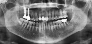 FIGURE 6. Panoramic  radiograph shows the augmented right maxillary sinus and  fixed bridges  in situ.