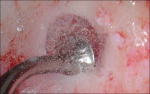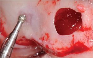 fig. 2. Buccal view of the beginning of the elevation of the Schneiderian membrane. The instrument used is a flat-ended noncutting tip (SL3; Satelec) on the piezotome.