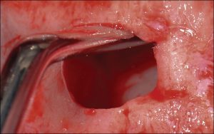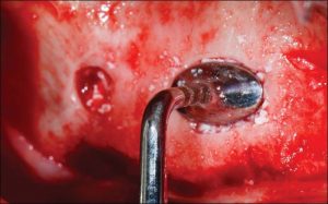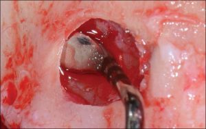 fig. 7. The SCC4 instrument (EBI) used as a gauge to create the window is also used to pack the xenograft into the maxillary sinus.
